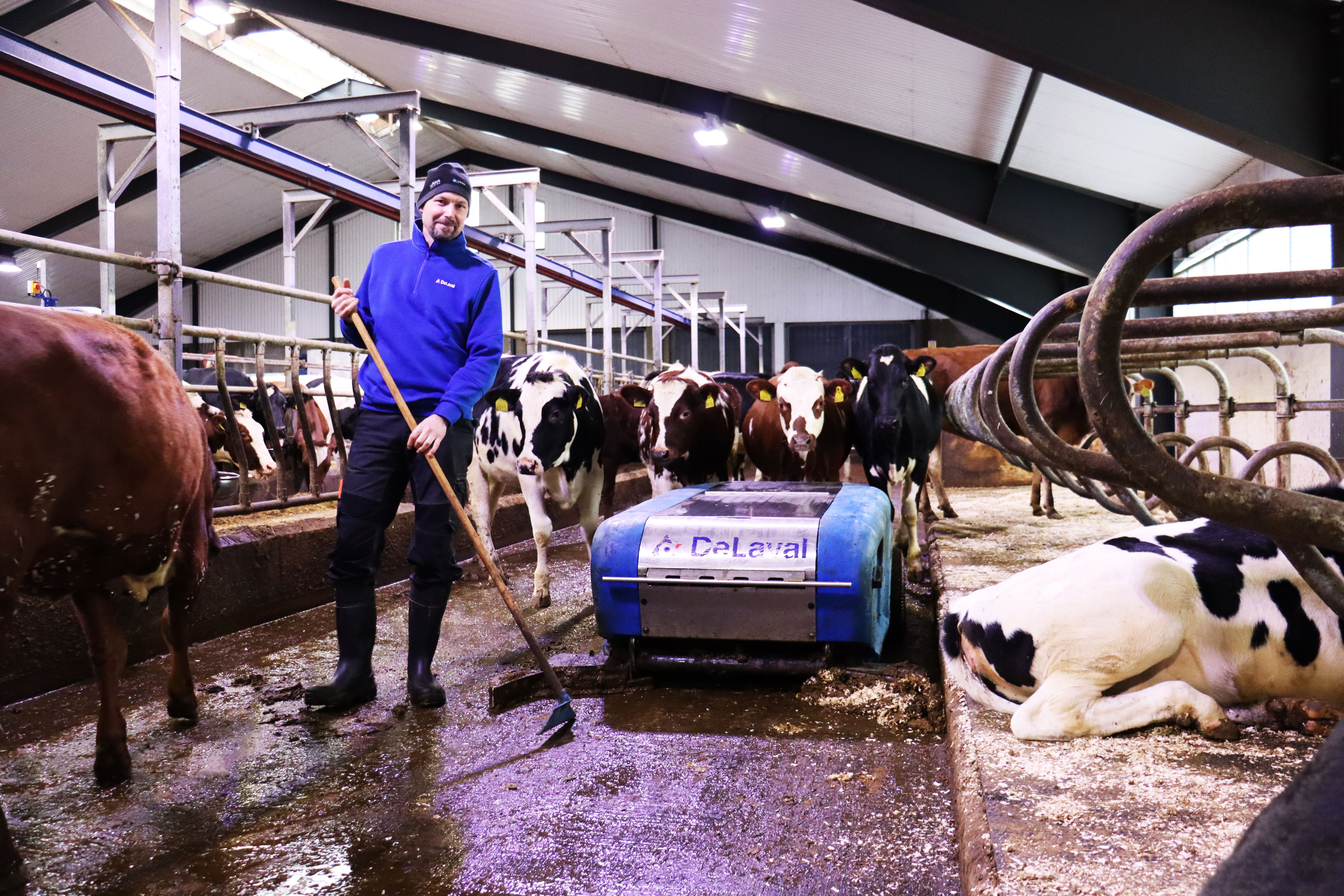 Samuel Eskilsson har spaltgolv vid mjölkkorna men vid kvigorna och kalvarna har han en skrapgång. De robotar som finns på marknaden skiljer sig beroende på om det är spaltgolv eller helgjutet golv men Samuel Eskilsson tycker att den här funkar till båda golvtyperna.